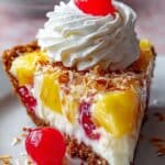 - Decorate & Serve: Before serving, create whipped cream swirls on the pie’s surface. Top each swirl with a maraschino cherry and sprinkle toasted shredded coconut over the top for added texture and flavor. Slice the pie and serve chilled for a refreshing tropical dessert experience.