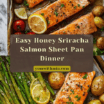 This Olive & Mango recipe features perfectly roasted salmon fillets served with tender asparagus, crispy baby potatoes, and juicy cherry tomatoes. The dish is elevated with a flavorful honey, dijon mustard, and sriracha glaze brushed onto the salmon, creating a harmonious balance of sweet, spicy, and tangy notes. Easy to prepare and baked all on one sheet pan, this meal is ideal for a healthy and satisfying weeknight dinner.