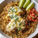 Pollo Loco Mexican Chicken and Rice with Queso is a flavorful one-pan meal featuring tender, spice-rubbed chicken breasts baked with seasoned rice, diced tomatoes with green chilies, and topped with melted Mexican blend cheese and creamy queso sauce. Garnished with fresh cilantro and lime wedges, this dish offers a comforting and vibrant Mexican-inspired dinner perfect for any night of the week.