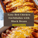 Keywords: red chicken enchiladas, baked enchiladas, Mexican chicken recipe, easy enchiladas, chicken and black beans, enchilada sauce