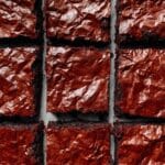 These red velvet brownies are extra chocolatey, fudgy, and chewy, featuring a bright red, shiny crinkle top and a dark, fudgy interior. Made with a blend of bittersweet chocolate, olive oil, two types of cocoa powder, and a touch of red food gel, they offer a rich chocolate flavor balanced with the signature vibrant red velvet color.