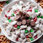 This festive Reindeer Food Recipe, also known as Christmas Puppy Chow, combines crunchy Rice Chex cereal, mini pretzels, peanut butter, and chocolate with a dusting of powdered sugar and colorful red and green M&Ms, making a delightful holiday snack that’s perfect for sharing or gifting during the Christmas season.