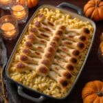 Rib Cage Mac & Cheese (Crescent Bone Edition) is a playful take on a classic comfort food, featuring creamy cheddar mac and cheese topped with arching crescent roll strips shaped like rib bones. This fun and delicious casserole combines a rich cheese sauce with tender pasta, then gets a creative makeover with golden, crispy crescent dough ribs decorated for a spooky yet appetizing look, perfect for themed dinners or playful family meals.