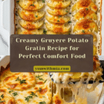 This Rich Potato Gratin is a creamy and decadent dish featuring thinly sliced potatoes baked in a velvety gruyere cheese béchamel sauce infused with aromatics like garlic, onion, thyme, and a hint of nutmeg. Perfect for a comforting side dish, the gratin is topped with a golden, bubbling crust of shredded gruyere cheese and baked until tender and beautifully caramelized.
