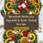 Keywords: delicata squash salad, kale salad recipe, roasted vegetable salad, fall salad, vegetarian salad, pomegranate salad, healthy salad, roasted squash broccolini