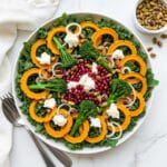 This vibrant Roasted Delicata Squash & Kale Salad combines the natural sweetness of delicata squash and broccolini with the hearty texture of massaged kale. Topped with fresh pomegranate seeds, roasted pistachios, tangy goat cheese, and a zesty lemon-thyme vinaigrette, this salad offers a perfect balance of flavors and textures that make it a refreshing and nourishing meal or side dish.