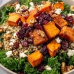 A vibrant and nutritious Roasted Sweet Potato Kale Salad featuring tender roasted sweet potatoes, protein-rich quinoa, tangy feta, and a zesty honey-lemon dressing. This salad combines earthy, sweet, and tart flavors with a satisfying mix of textures, perfect for a wholesome lunch or as a side dish.