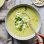 Keywords: zucchini soup, roasted zucchini, creamy soup, Mediterranean soup, feta cheese, roasted vegetables, healthy soup