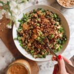 A vibrant and crunchy Satay Crispy Rice Salad featuring crispy oven-toasted rice, tender chicken, fresh herbs, and an irresistibly creamy peanut satay dressing. This dish balances textures and flavors perfectly, offering a delightful fusion of Asian-inspired ingredients for a satisfying and colorful meal.