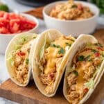 These Slow Cooker Queso Chicken Tacos are a flavorful and easy-to-make meal perfect for busy weeknights. Tender chicken breasts are slow-cooked with taco seasoning, tomatoes, and green chiles, then mixed with creamy salsa con queso for a cheesy, spicy filling. Served in street taco-sized flour tortillas and garnished with fresh toppings, these tacos offer a delicious Tex-Mex experience with minimal effort.