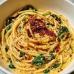 This Spaghetti & Spinach with Sun-Dried Tomato Cream Sauce recipe combines tender pasta with a rich, creamy sauce infused with sun-dried tomatoes, fresh spinach, and garlic. Topped with Parmesan cheese and optional red pepper flakes for a slight kick, it’s a quick and flavorful vegetarian meal perfect for any weeknight dinner.