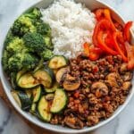 A quick and flavorful Spicy Ground Beef Stir-Fry Bowl featuring garlicky sautéed vegetables and a savory, slightly sweet sauce. Perfect for busy weeknights, this recipe combines tender ground beef with crunchy broccoli, bell peppers, zucchini, and mushrooms, all served over steamed white rice. Easily customizable with ground turkey or plant-based alternatives and adjustable spice levels.