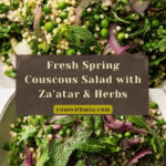 A fresh and vibrant Spring Couscous Salad featuring tender pearl couscous, blanched English peas, bright lemon-marinated red onions, fresh herbs, and crunchy roasted pistachios, all tossed in a fragrant za’atar and garlic olive oil dressing. This salad is perfect as a light lunch or a colorful side dish that celebrates the flavors of spring.