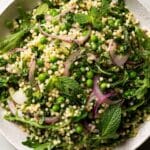 A fresh and vibrant Spring Couscous Salad featuring tender pearl couscous, blanched English peas, bright lemon-marinated red onions, fresh herbs, and crunchy roasted pistachios, all tossed in a fragrant za’atar and garlic olive oil dressing. This salad is perfect as a light lunch or a colorful side dish that celebrates the flavors of spring.