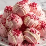 - Decorate: While the coating is still wet, sprinkle with crushed freeze-dried strawberries, pink sugar, or sprinkles, pressing gently to adhere. Let the coating set completely. Melt white chocolate similarly, transfer to a piping bag or zip-top bag, and drizzle over the truffles. Add any final toppings immediately. Allow all decorations to set fully before serving or packaging.