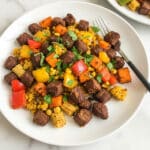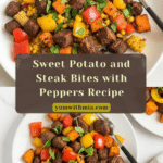 These Sweet Potato and Pepper Bites with sautéed flat iron steak are a vibrant, flavorful dish combining tender sweet potatoes, colorful bell peppers, and perfectly seared steak. Quickly cooked on the stovetop, this recipe delivers a nutritious and satisfying meal with a blend of savory and fresh flavors, finished with a touch of coconut aminos and fresh cilantro.