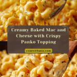 Tini’s Mac and Cheese is a rich, creamy, and comforting classic dish featuring tender elbow macaroni enveloped in a luscious blend of sharp cheddar, mozzarella, and Parmesan cheeses. This recipe includes a creamy homemade cheese sauce with a hint of Dijon mustard and aromatic garlic and onion powders, topped with a crispy buttery panko breadcrumb crust achieved under the oven broiler for an irresistible finish.