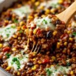 A hearty and flavorful Vegetarian Mexican Lentils recipe featuring brown lentils, sweet potatoes, black beans, and a fragrant blend of spices. Perfect as a comforting and nutritious meal topped with cheddar cheese.