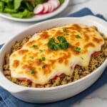 - Add Cheese and Bake: Sprinkle shredded mozzarella and Parmesan cheese evenly over the top of the casserole. Cover with foil and bake for 20 minutes. Remove the foil and bake uncovered for an additional 10 minutes until the cheese is bubbly and slightly golden.