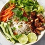 A vibrant and flavorful Vietnamese Noodle Bowl with tender lemongrass-marinated chicken, fresh vegetables, and a tangy, sweet-spicy dressing. This dish is perfect for a light and healthy meal packed with fresh herbs and the perfect balance of savory and citrusy flavors.